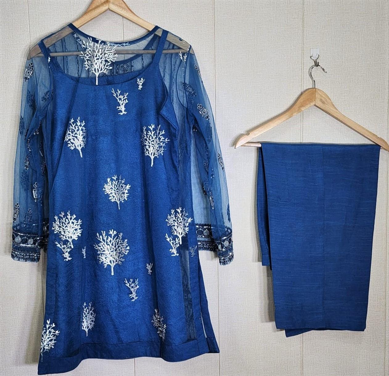 Beautiful Eid Collection Colour With Elegant Neat Embroidery is an admirable outfit that consists of a pleasing pure Net Shirt with blooming, delicate embroidery on its daman. A stunning, running back Side with Block Print and solid-hued straight trousers with Hanging Beats On Demand and trousers also on sleeves, make this ensemble a complete package for the Eid season.